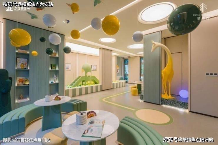 实景楼栋展示区,入户依然是精致的动线,中间一楼架空层是儿童嬉戏区,有奶绿色的如同油牛果千层的椅子、可爱的攀爬梯,还有一只黄色长颈鹿顽皮地探着头。