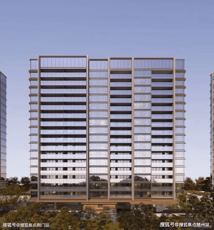 高层立面采用“三段式”设计,基座为深灰色石材,中部为浅灰色铝板与玻璃幕墙,顶部为金色铝板线条,形成“山-水-天”的层次感。