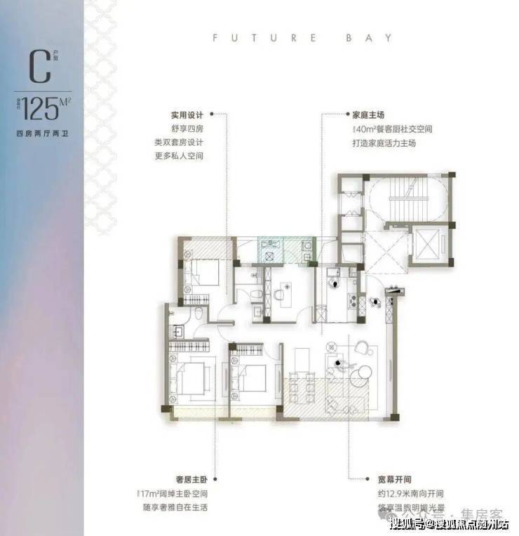 约139方户型, 4.5开间朝南+储藏间,南向15.9米超大采光面,做到五开间朝南的空间,标配储藏间,三个南向卧室设计。