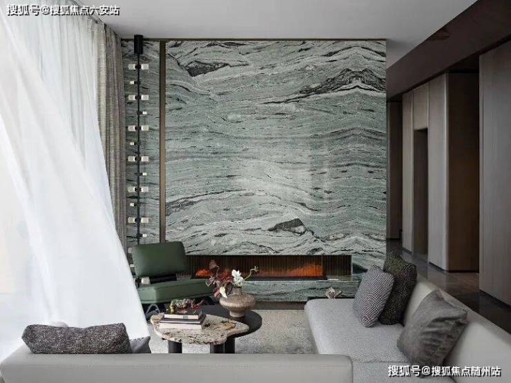 印象最深的,就是墙上的大面青绿或淡墨奢石,大理石从客厅一直铺到卫生间地面。