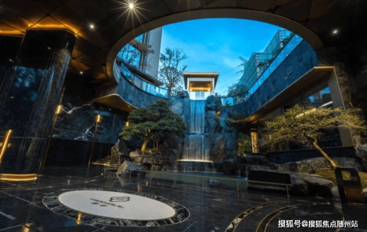 来到入口第一眼,约7米高隐奢门庭如画卷般在眼前展开,一座施华洛世奇中国应用中心定制的安云雕塑高高耸立,43000片黄金、白金金箔为底,82000颗水晶钻石做饰,搭配喷泉轻柔如丝,璀璨交相辉映,营造梦幻般的氛围,见此你就读懂了何为“显赫的具象化”。