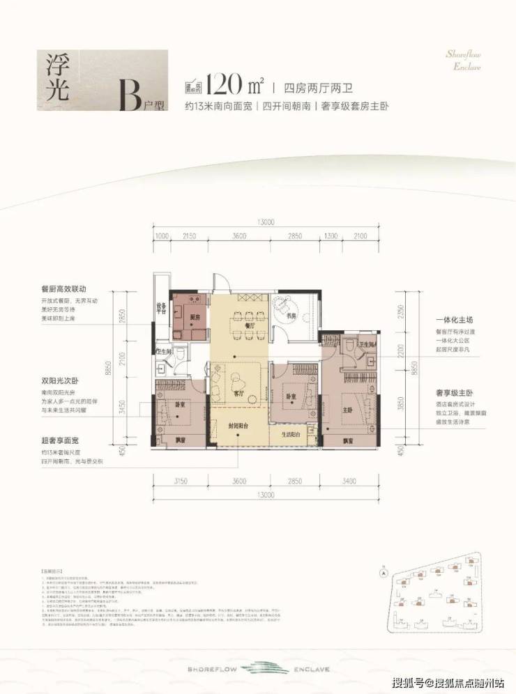 建筑面积约120㎡B户型,采用了四开间朝南的排布方式,总面宽约13米。三个卧室和餐客厅均朝南,让每一个空间都拥有南向阳光平权。餐客厅和次卧连接了一个双联大阳台,双飘窗,赠送面积多。而且客卫就在次卧边上,生活起居也是便捷不少。
