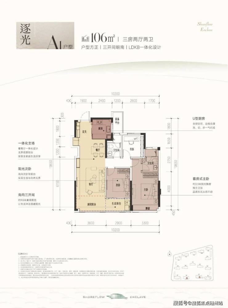 建筑面积约106㎡A1户型,户型方正,三开间朝南+LDKB一体化设计,基本没什么浪费面积。虽然是中间套设计,但做到了全明户型,通风效果好,可以说杭州少见。