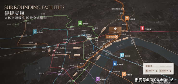 项目地处钱江新城二期核芯,立体路网通达全城。红普南路通车后,经之江东路隧道约6分钟即可抵达杭州新地标江河汇,约10分钟可达万象城,是目前在售新盘中到达江河汇最近的项目。同时,项目家楼下即为地铁口,并与规划中的连堡丰城超大地下商业空间(总体量约33万方)无缝衔接,出则繁华,入则宁静。