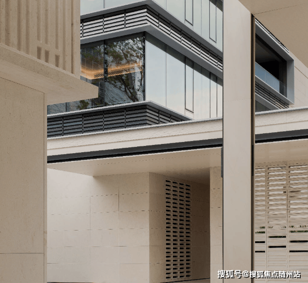 外立面:首层石材 + 上层铝板 + 玻璃 + 陶砖,现代东方美学