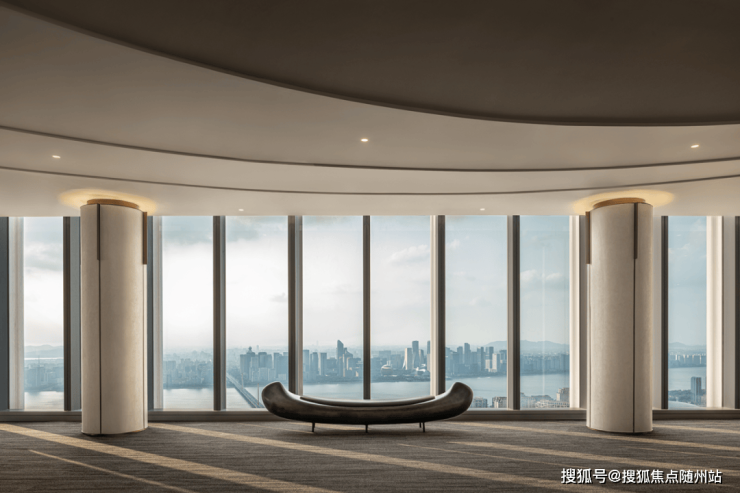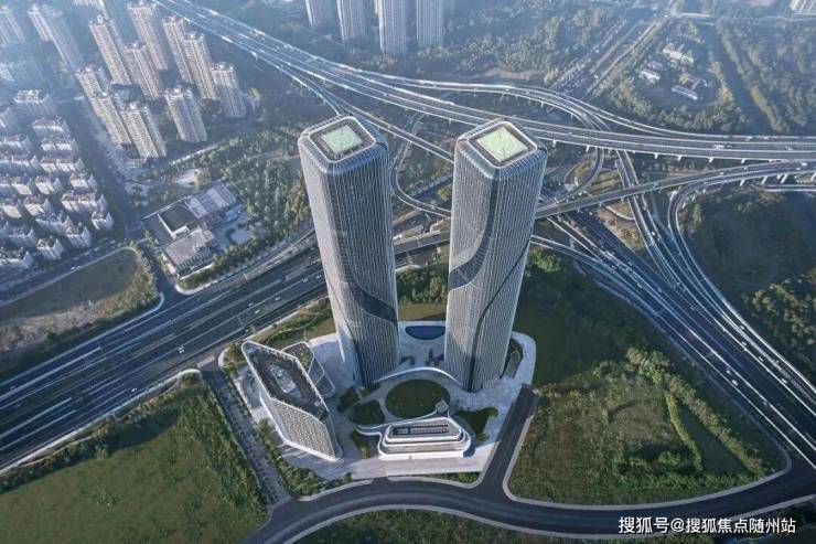 两幢超高层建筑与多层配套辅楼相互映衬,设计灵感取之于杭州钱塘江的钱塘潮涌,借江水的机理营造“门”的意向,环绕构建出一个开放的绿色公共空间。由 5 栋建筑构成,涵盖了办公、公寓、商业及城市公园等多种业态功能。