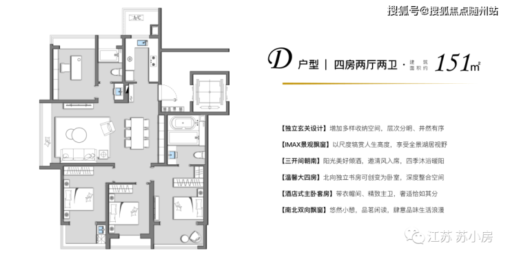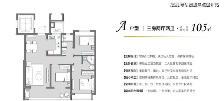 客厅拥有绝佳的湖景视野,极致占有苏州稀缺的湖景资源!同时该户型做到了三卧朝南,主人、老人、小孩都可以睡在朝南面,实现“阳光平权”。