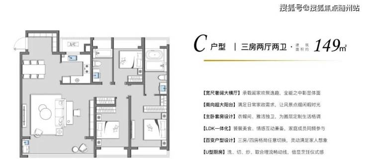 超9.4米面宽,采光方面在同级户型中可以说是无敌的存在;客餐厅一体化,让视野更大,空间感更足;约6米阳台,阳光时刻肆溢,同时满足业主的生活小意趣。主卧套房设计,干湿分离卫生间,满满的设计巧思,满足二人世界到三口之家的品质需求。