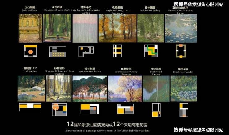 在园林景观打造中,海晏天珺以游廊式度假酒店场景为基底,通过15条景观轴线、30个对景庭院,来营造多元体验的度假生活场景。内部则以12幅印象派油画,演变构成12个天珺高定花园点缀其中,每一个转身,都是不同心境的转换。