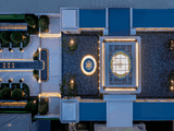 入口处的水景和罗汉松将仪式感直接拉满,再往前走近,四水归堂格局的会客厅如同一个巨大的聚财瓶口,雨季跌水落下配合镜面般光滑的水景,像极了高星级酒店大堂。