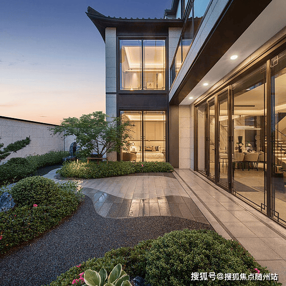 新徽派建筑风格,浅色石材搭配日式合瓦屋面,融合歇山、硬山等传统手法,外立面经20000K火焰喷烧工艺处理,兼具典雅与时尚。园林以珠宝形意造景,种植百年香樟、红枫,打造四季生态。
