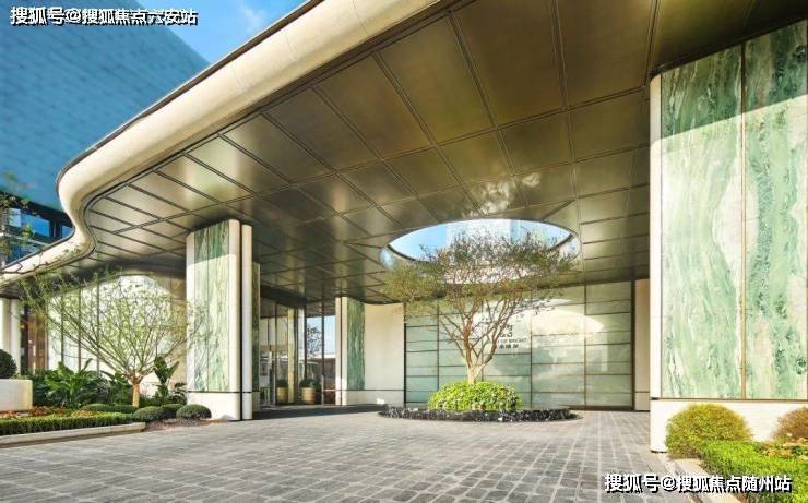 约7米高的主入口,把贝金米黄石材、维多利亚绿等名贵石材,与古铜色金属板、紫薇等名贵草木巧妙搭配、相得益彰,犹如穿着翠绿华服的翩翩公子,透着一身贵气。
