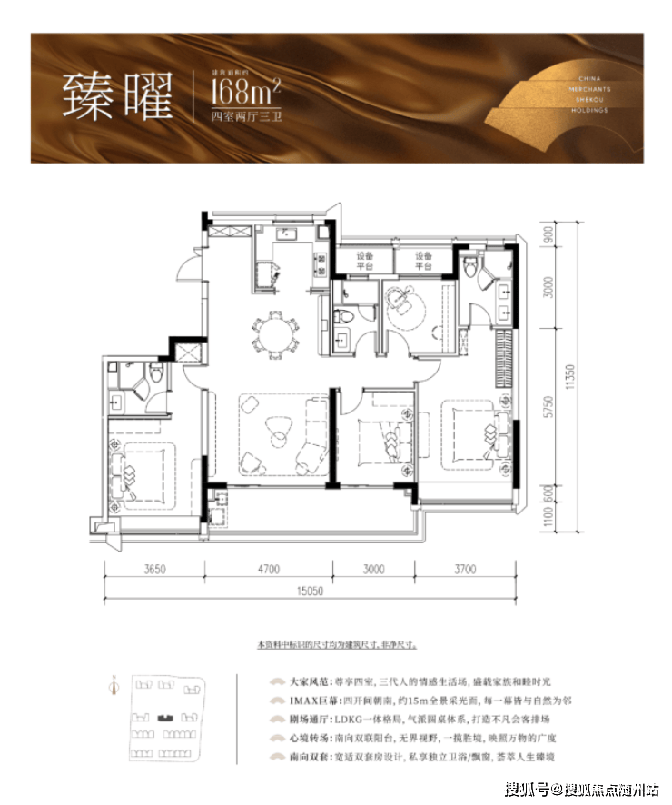 168㎡:四房两厅三卫,双阳台设计,约15米南向面宽,IMAX级采光,配置独立衣帽间、书房