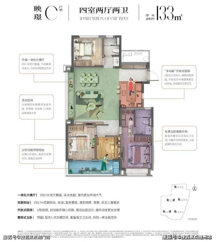 客厅面宽也从常规的约3.4米扩展到了约3.6米,让公共空间更加明亮宽敞。 双联宽景阳台达到了约6.7米,晾晒空间更大、视野更好,还能作为瑜伽、健身等活动空间。