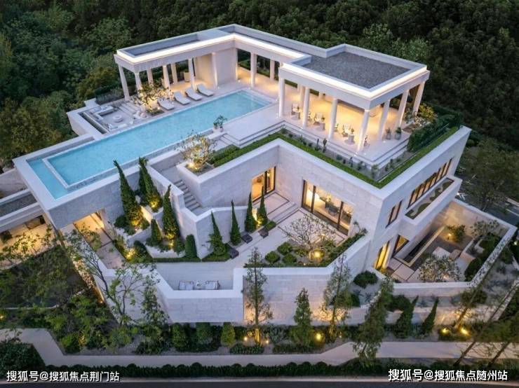 比如,你能看到入口那片很美的镜面水池,被法式廊柱包围出强大气场;你也能看到地下约8.2米层高的室内恒温泳池,它的上方正闪烁着从镜面水池透射下来的日光;