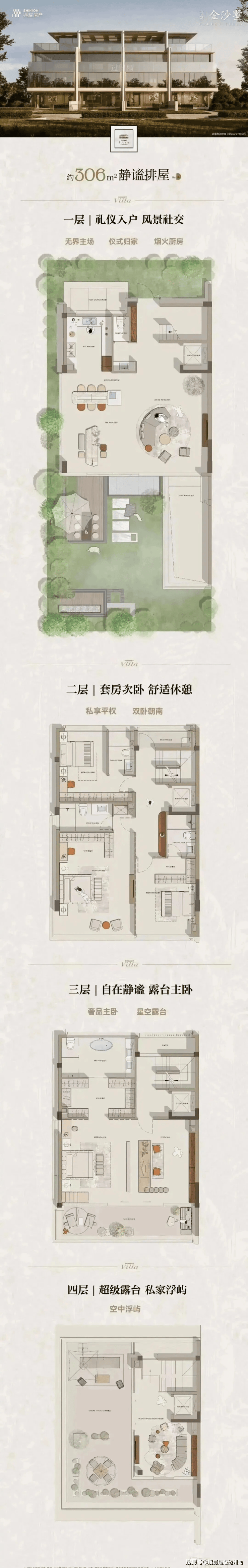 户型:建面约285㎡、316㎡、365㎡,地上四层+地下两层(层高5.8米),实得面积超600㎡,实现“类独栋”居住体验。