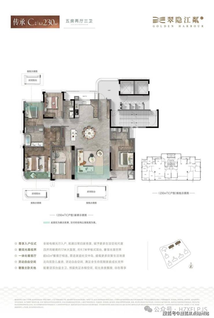 在杭州目前新房市场中,使用率能真正做到约90%的楼盘,凤毛麟角。翠隐江粼轩通过封闭阳台只算半面积+电梯厅空间转化(公区),实现使用率最大化。建筑面积约230㎡户型更是做到了近66㎡客餐厅+双套房布局,空间感媲美很多二手老豪宅的260㎡。