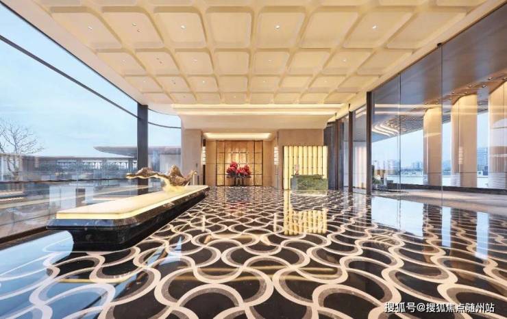 约80米宽宏门头搭配9.5米高鎏金大门,藻井星空顶与汉白玉雕塑“金玉流芳”相得益彰,归家仪式感直接拉满。