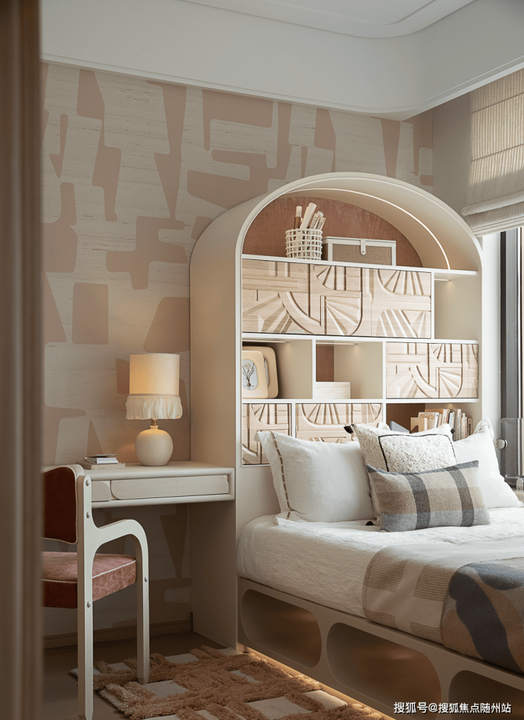 女孩房以粉白色为调,营造童趣唯美的成长天地。床体与收纳柜一体设计,弧形顶柜兼具收纳与装饰功能。飘窗,成为安顿身心的精神角落。展卷小憩或凭窗静思,皆可于熟悉的日常中,抵达诗意栖居的真意。