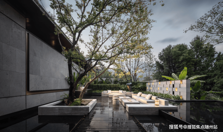 宽阔的门头有古松相迎,含蓄的格栅与天井透露出隐奢意境。