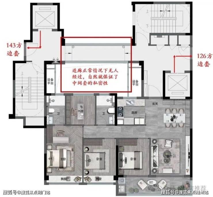 首先这个户型解决了中间套的隐私问题,如上图所示,两个边套回家都不需要经过连廊,所以保证了中间套的私密性。