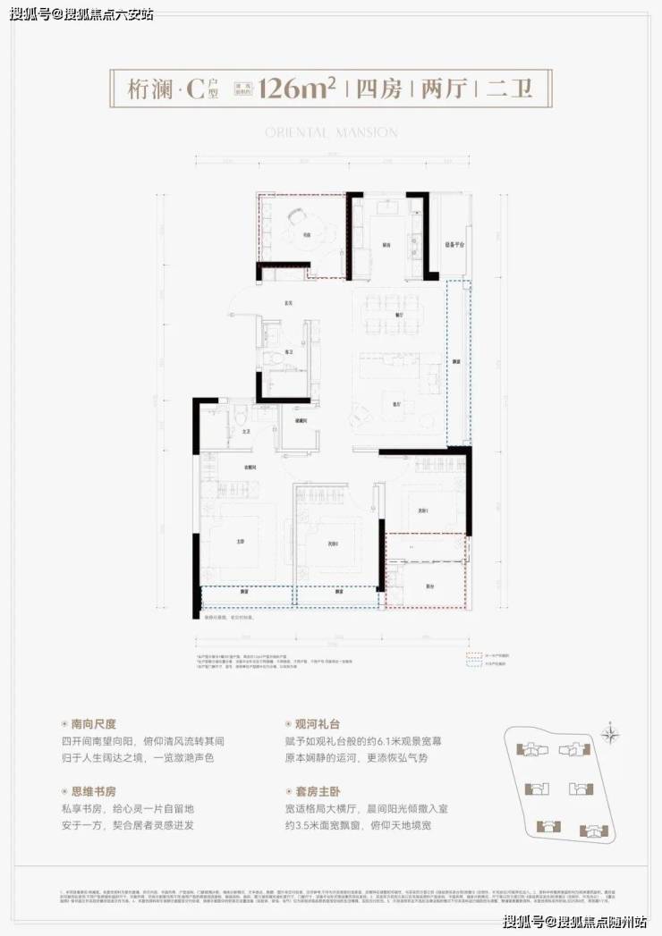 该户型得房率高达约93%,南向3个卧室,采光优良,客厅面积达到约37平方米,充分满足二胎家庭或三代同堂的居住需求。建面约126方户型则采用四开间朝南的尊崇布局,主卧配3.5米宽景飘窗,更享6.1米观景宽幕,让家居空间成为“运河头排观景席”。