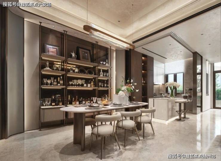 客餐厅采用一体化设计,通过石材、影木、皮革、金属、玻璃等不同材质在光影下的交织,形成张弛有度的现代轻奢多元的场景体验,内敛优雅,充盈着浓郁的都市质感。