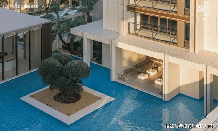 作为首个度假风情的住区,璟逸汲取希腊安缦酒店与Gundari度假村的精髓。素雅的米白石壁墙引领访客,穿行于水院与连廊之间,步入白色莱姆石建筑群,冰蓝水面与沙生植物交织的闲适景致,仿佛将圣托里尼的暖阳拥入怀中。入口处显眼的“矮大紧”树种,介绍说是有上千年树龄的油橄榄,这类树种单棵价格起码有250万,相当的豪气。