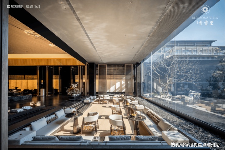 建筑立面:古今交融的诗意表达:外立面以香槟金铝板为基调,搭配蓝眼睛石材与玻璃幕墙,融合传统歇山重檐、纳福悬鱼等元素,既保留宋式建筑的对称美学,又赋予现代建筑的轻盈通透。合院组团采用三面庭院设计,L型景观面与环绕式檐廊,将超山梅影、丁山湖光引入每一扇窗景!