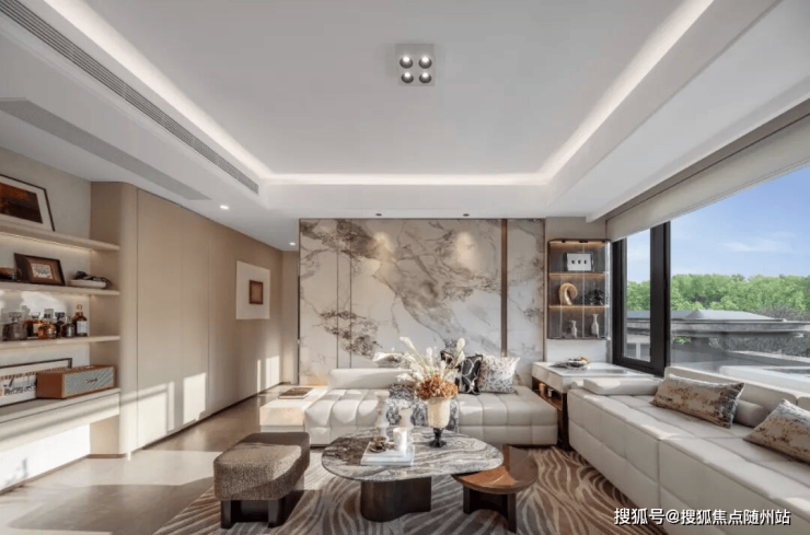 岩板上的玉石纹理透露出高贵与雅致,而充满生机的盆景树巧妙地将自然之美与艺术之韵交织在一起,成为空间视觉的绝妙点缀。