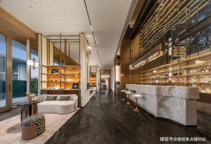 Logo转译石材地面拼花,金属晕染的接待台在璀璨的水晶屏风映衬下,熠熠生辉。目光透过屏风,开启“窥园模式”,超大落地窗将水景庭院直接框成动态壁纸。