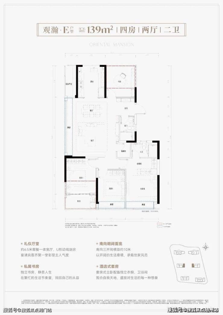 鸣澜里139平户型同样做的不错,打造四房两厅两卫,分为横竖两款,全部为边套,两梯两户设计。其中,139平竖厅户型亮点分析:①户型得房率超高,达到约93%;② 南向3个卧室,采光优且满足二胎家庭和三代同堂居住需求;③ 客厅面积达到约37平,足够大,同时额外配置约2.6平的储物间。