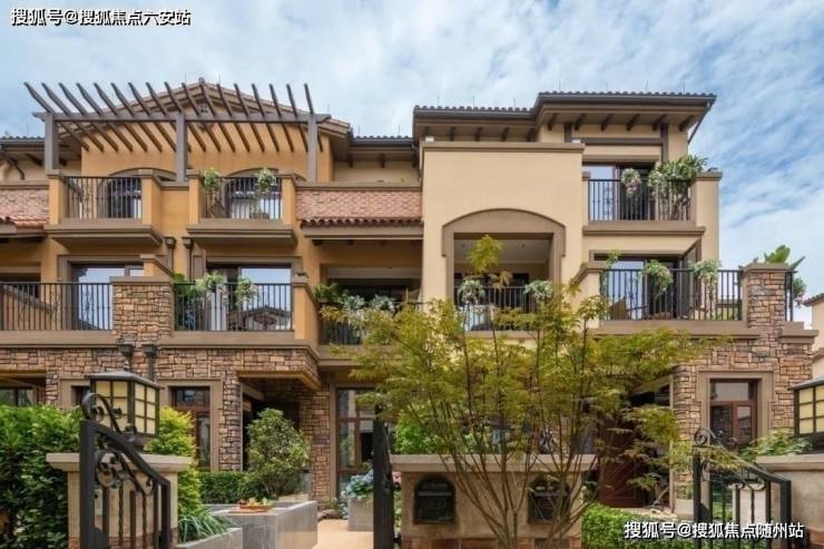 红瓦米墙、坡顶拱门、铁艺雕花等元素复刻南加州度假风格,坡地错落布局保证每户视野通透性与私密性。