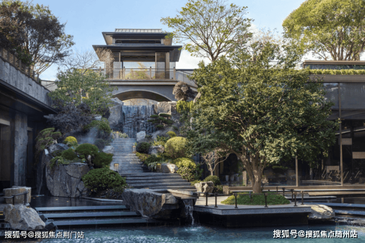 园区中央是建面约2000㎡的下沉式会所,恒温泳池与户外瀑布水景交相辉映,健身房、茶室、私宴厅皆绕中央水庭而设。
