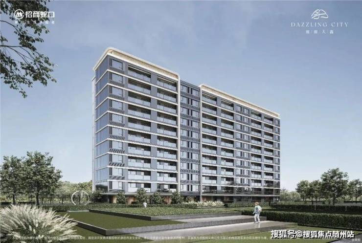 璀璨天鑫外立面延续招商经典IP视觉——非对称宽幕立面设计,香槟金金属板+浅灰色质感立面,特色的风帆塔冠造型,立体层次感更强,精致而不繁琐。