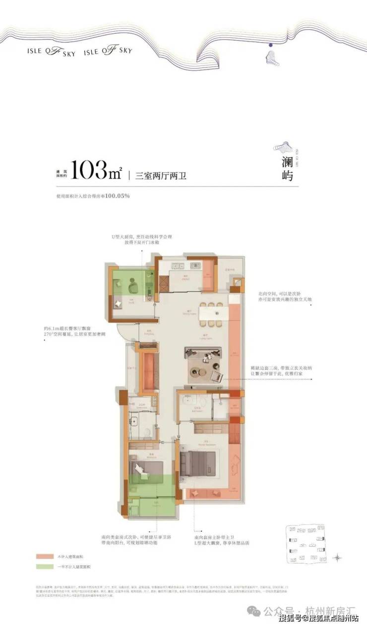 建面约103㎡明星边套户型,是目前市面上实用率最高的三房格局,得房率高达100%,绝对的“0公摊”,主卧竟然设计270°转角飘窗,通常只在市中心千万级豪宅中才会看到,是全杭州小户型中的唯一级了。