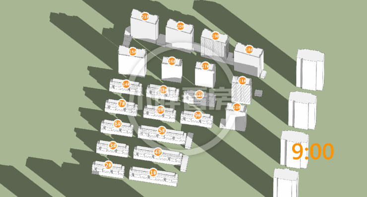 夏季:由于楼栋建筑朝向为西南偏转和夏季太阳角度原因,楼栋在上午处于阴影中,日照时长有相应折损。