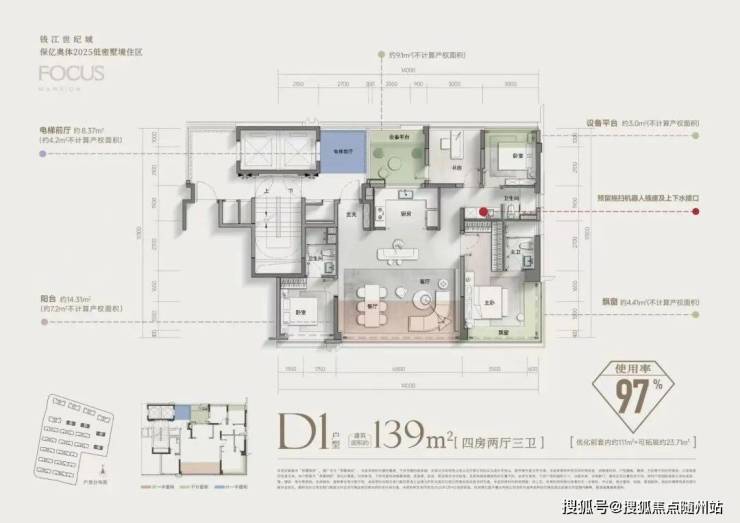 先看建面约139㎡四房三卫户型。LDKB的户型设计;封包阳台+主卧L型飘窗;双套卧、三卫;南向超大开间;专梯专户、尊享电梯前厅...