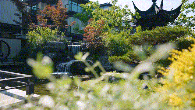 中央园林假山高立,跌水飞瀑,假山上还有一座飞檐翘角的凉亭,取名「四景亭」,就像那幅著名的宋画《四景山水图》,在这里,观四季。