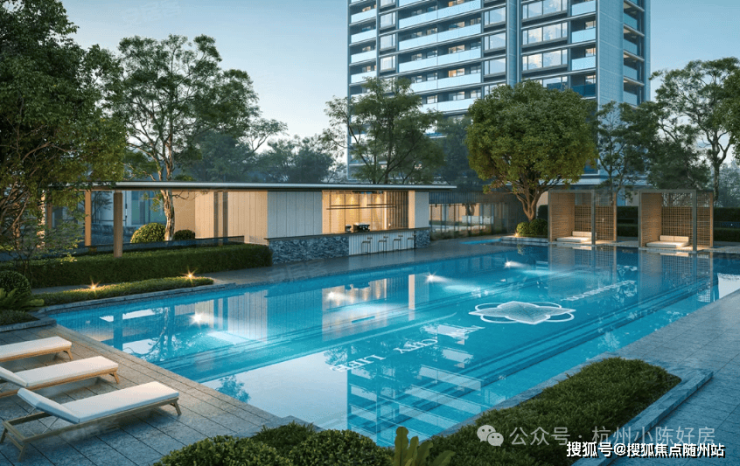 在中央设置了度假泳池综合区,规划泳池吧台、卡座等多个功能区,旁边还设计了颇富江南韵味的阳光水院和临水廊亭,且无界联通健身区、童趣乐园、长者花园等主题空间,营造步移景异的多重园境,下楼就能拥有度假酒店的松弛氛围。
