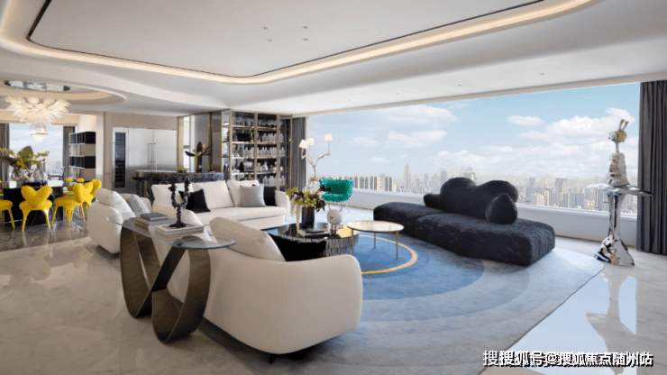 约300㎡“观湖”,谢柯打造;另一款是更宽舒的约412㎡“行云”,出自邱德光。尤其是约412㎡“行云”,无论玄关处雪花白、劳伦黑金、金世纪的大胆拼花,瓦楞式的波浪形电视背景墙,还是吸睛的普拉达绿石材吧台,全屋随处可见出色审美和奢华材质的完美结合。