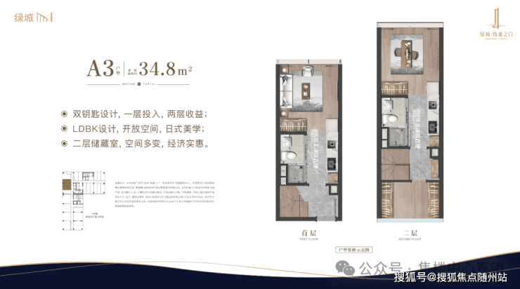 建筑面积约34-59㎡双钥匙公馆,买一层享两层,双倍空间,灵活多变,满足居住、办公、投资等多重需求,是杭州难寻的60万以下小户资产,且为实景准现房,小投入回报快,明星产品价值显著。