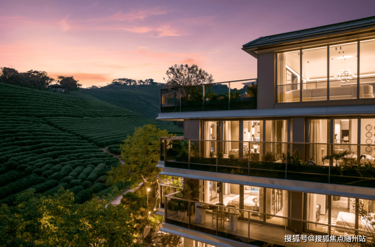项目采用黑屋顶中式叠墅风格,屋顶线条借鉴江南传统坡顶,却以大面积玻璃替代传统墙体,最大化“景屋相融”。白天,阳光透过玻璃在地面投下茶山光影;夜晚,室内暖光与茶山夜色呼应,建筑仿佛从自然中“生长”而出。