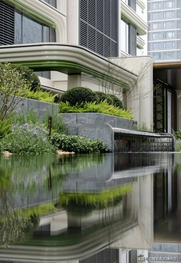 “步入洋房区,城市的喧嚣被瞬间屏蔽,迎面而来的是极具私密感的‘琉光水院’。以深邃的深绿色奢石铺陈水底,一侧矗立着极具流动感的特色艺术灯具,宛如庄园里凝固的时光飘带。它不仅是一处水景,更是洋房区客户高雅品味的象征。在潺潺流水与繁茂林木的掩映下,建筑的玻璃幕墙倒映着天光云影。在这里,每一次归家,都是一次从繁华向内心的隐奢回归。