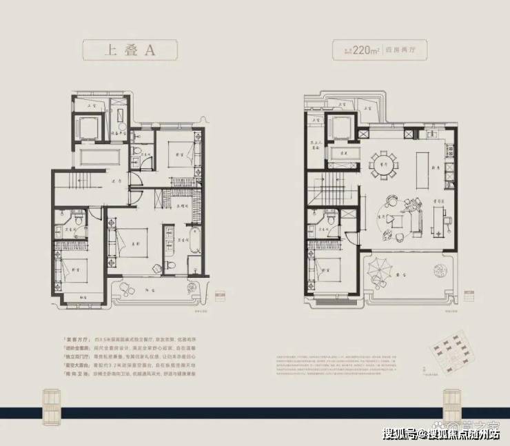 - 上叠:约220㎡阔境云墅,为精英家庭打造空中私域。双层立体空间设计,客厅挑高尽显恢弘气度,主卧套房配备独立卫浴与步入式衣帽间,更有星空露台延伸生活想象,可莳花弄草、品茗观星,将城市天际线与湖山景致尽收眼底。