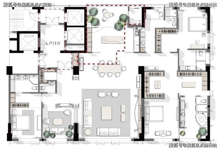 总裁私享领域:双衣帽间、双卫浴、约8米观景阳台,主卧套房面积超150㎡,媲美五星级酒店总统房。