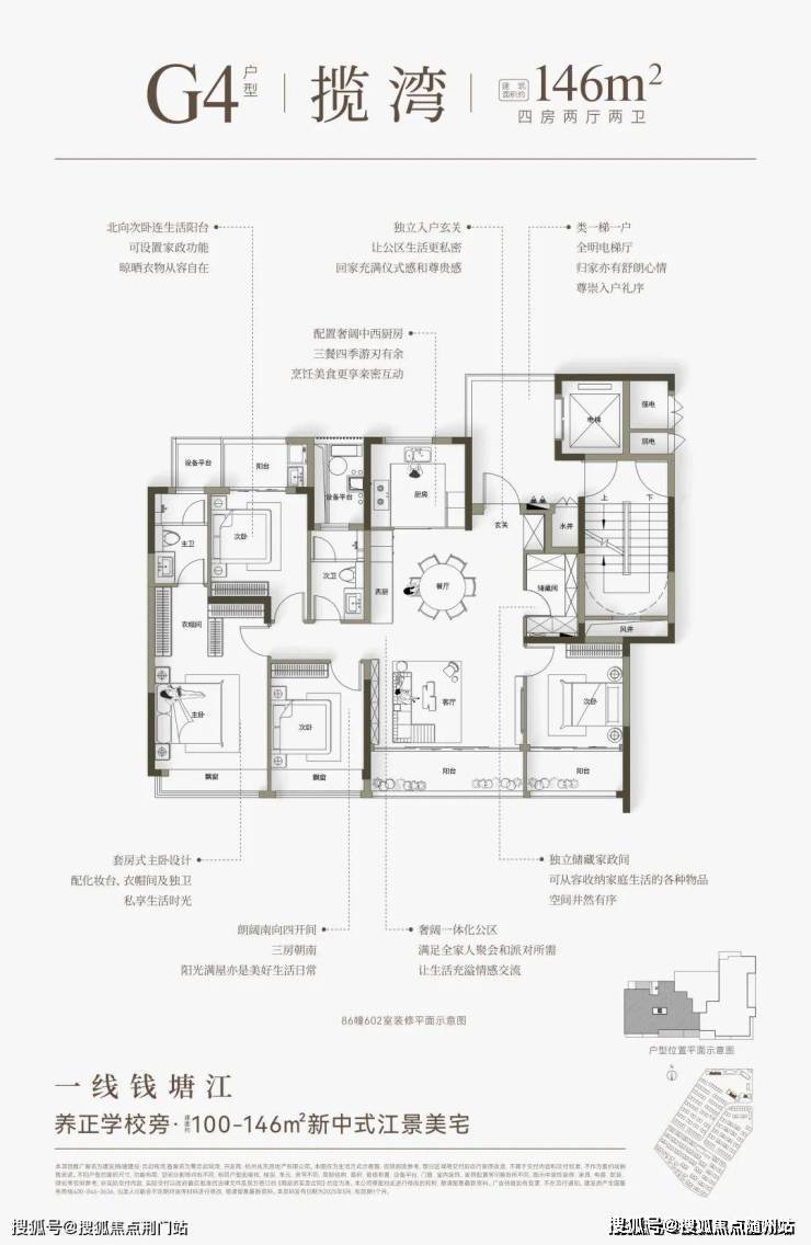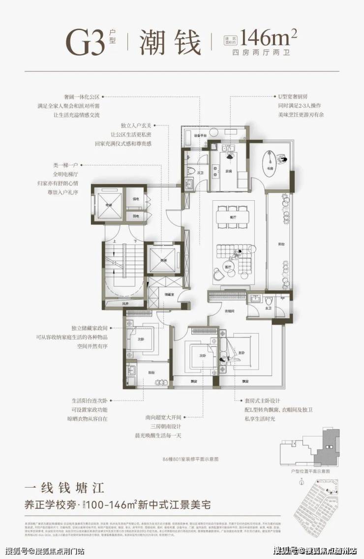 首开1幢高层,均为建面约146㎡四房。两梯两户,独立电梯厅设计为全明采光的“入户光厅”,每次出入都有明媚阳光相伴。