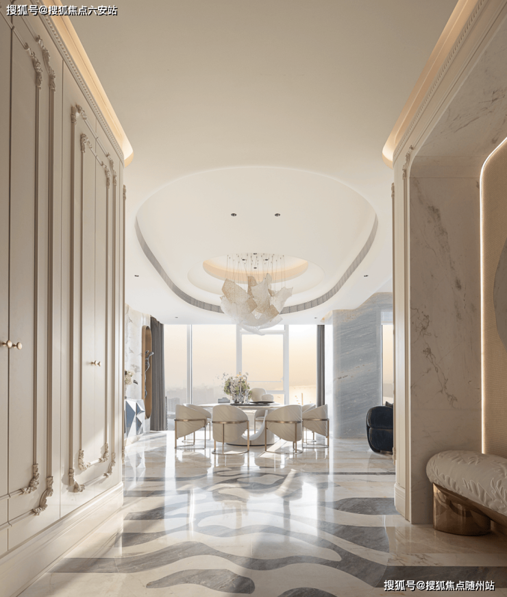 而且从水刀拼花的奢石地面、原石雕琢的墙面,到“亭台楼榭”感的悬浮空间,以及和墙面纹样一致的电梯厅荷叶纹,目光所及,是一种更轻盈的奢感。