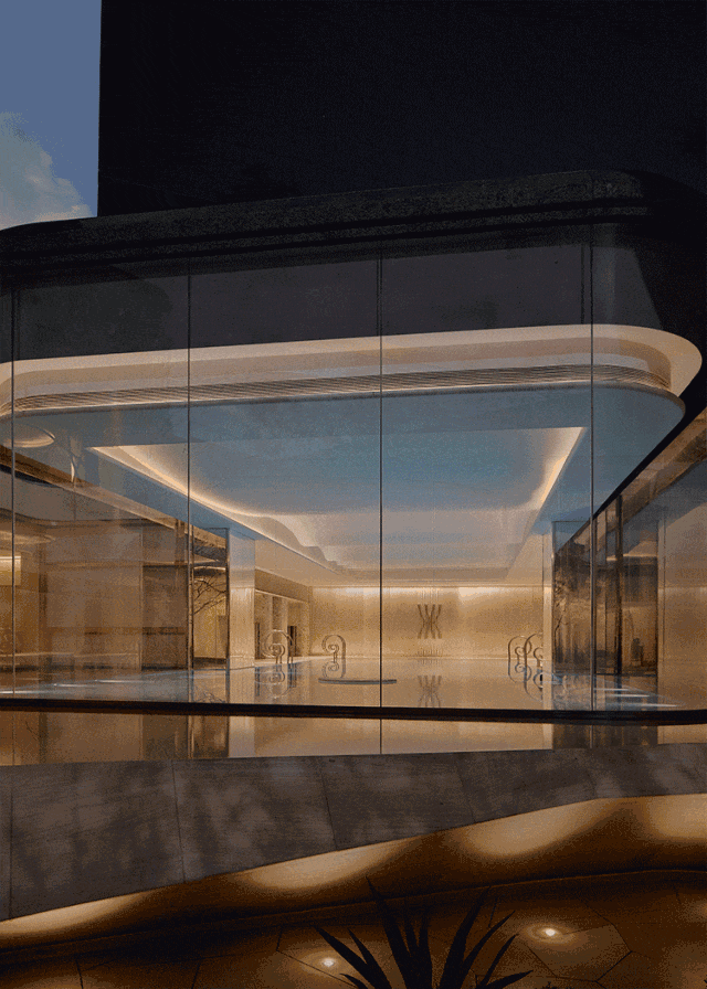 步入峡谷般的大门,回廊水院豁然眼前,这是杭序府的二进空间——天光云廊,灵感源自嘉佩乐酒店的环形前场,柔和地过渡了园区内外,三层通高的洄游体系串联地下会所、车库与架空层,挑空设计灵感汲取自峡谷峭壁,构筑高效立体的空间秩序,过廊墙面铺陈象牙白纹石,肌理宛若流水雕琢过的天然岩壁,星点灯光点缀其间,宛如峡谷星光,深邃静谧。