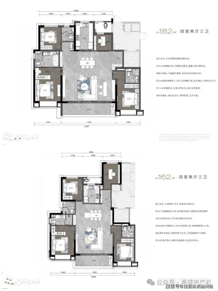 这个5个户型整体都非常相似,都是三开间朝南设计,区别在于客厅、房间的面宽在不断变大。但对于162平以上来说,这几个户型就非常一般了。